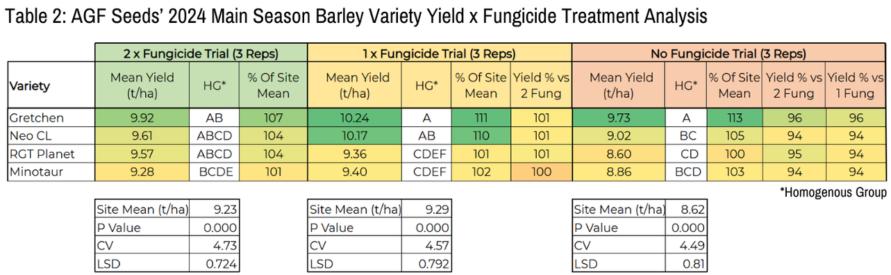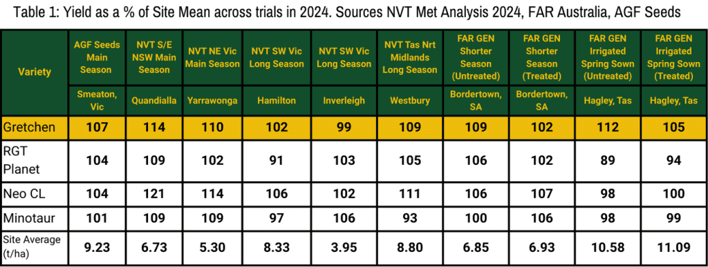 Gretchen has shown in trials the potential to outyield RGT Planet and to be competitive with Neo CL. In Fungicide trials in Smeaton Victoria, Gretchen has shown the strength of its disease package by seeing little yield penalty in low or no fungicide trials