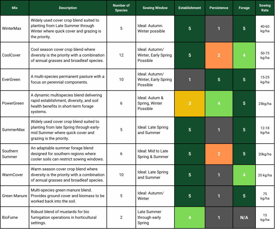 Widely used cover crop blend suited to planting from Late Summer through Winter where quick cover and grazing is the priority. Range of species included to maximise quick cover and forage production. Can be used between or before summer crop rotations for grazing, brown or green manuring.